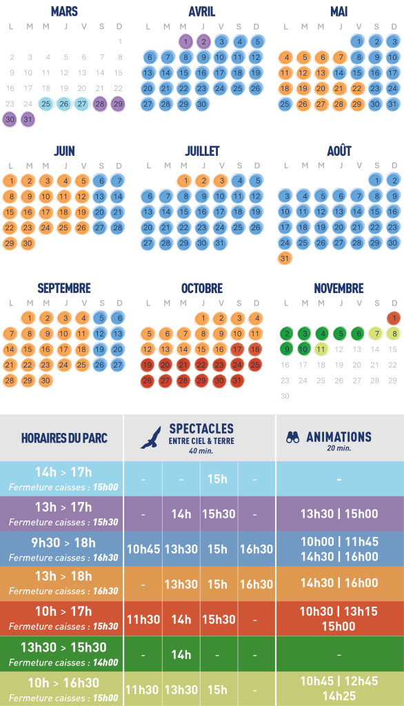 Consultez rapidement notre calendrier 2026 pour connaître les jours d’ouverture de la Volerie