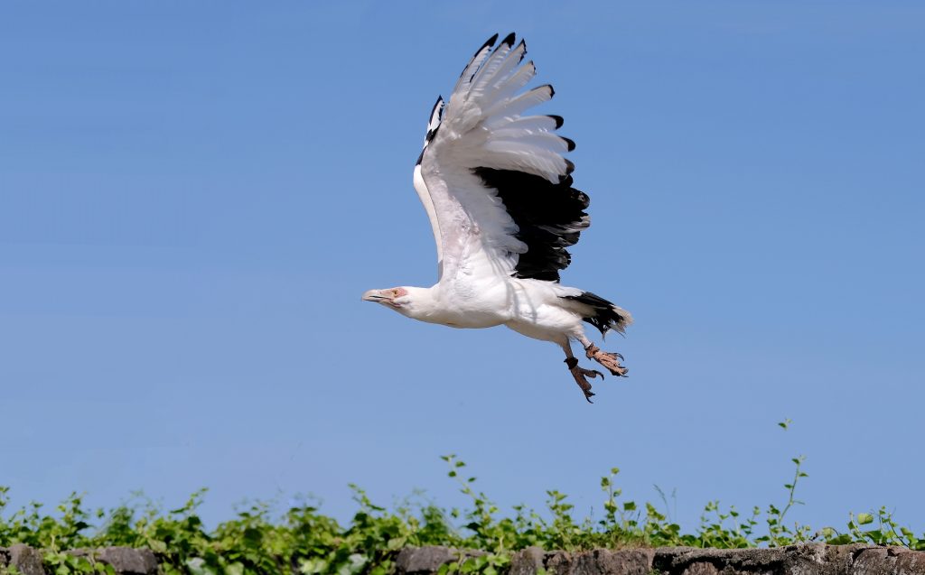 Rare chez les rapaces, ce vautour se distingue par son régime atypique : il est en grande partie frugivore, se nourrissant de la chair des noix de palme. Toutefois, il reste un vrai vautour, n’hésitant pas à consommer des cadavres de mammifères ou de poissons.