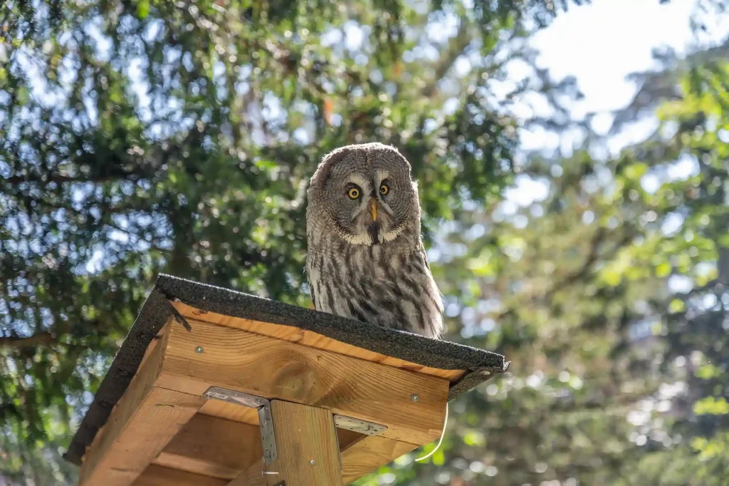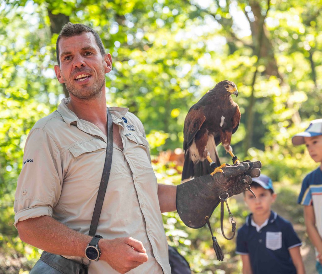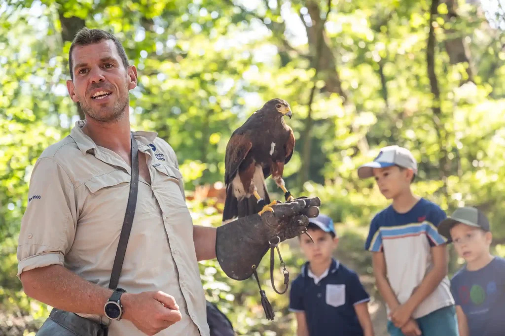 Aux premières heures d’ouverture de la Volerie, suivez le soigneur, et à ses côtés, une buse de Harris qui prend son envol. D’un battement d’ailes souple, elle passe d’une branche à l’autre, rasant parfois les visiteurs avant de revenir se poser, attentive et confiante. Observez le dialogue silencieux entre l’oiseau et l’humain. Vous êtes témoin de cette complicité unique, dans un décor où la nature et l’oiseau dictent le rythme.